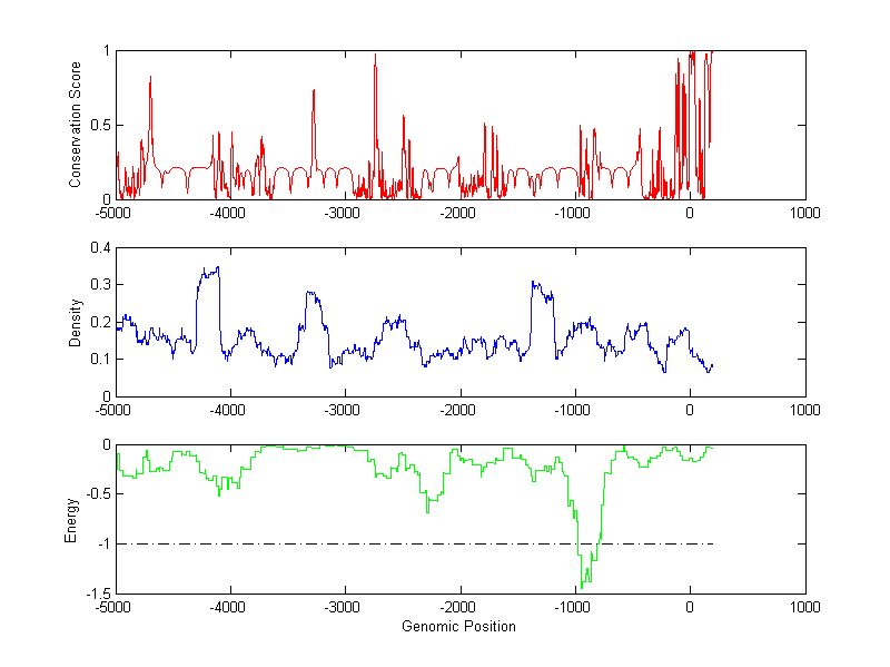 The energy profile (green curve) is about energy for module detection based on TF interaction. The positions with energy less than -1 indicate the existence of CRMs.