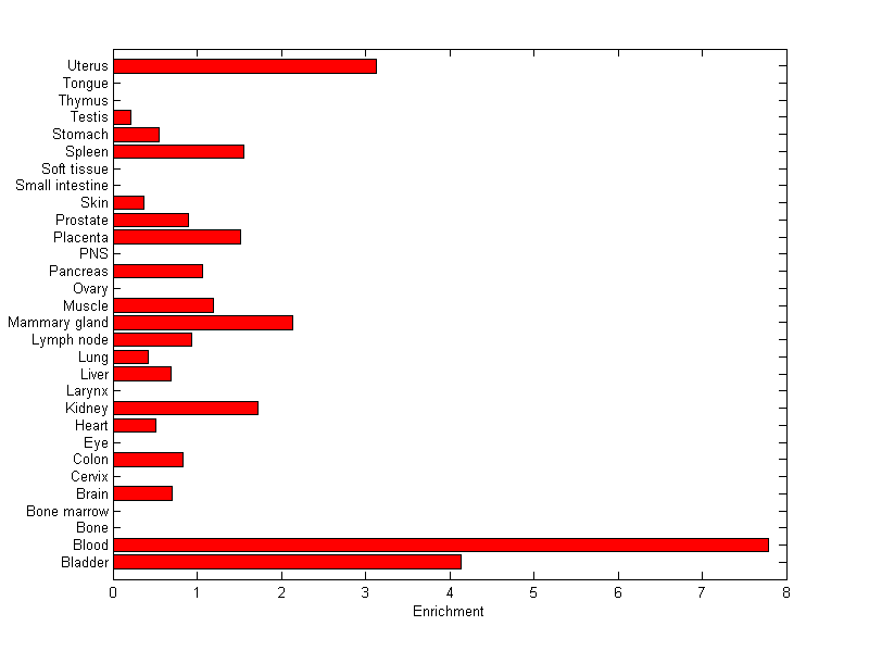 The expression level is normalized with tissue-library size. Each value for a gene in a tissue is a ratio of observed ESTs to the expected one in this tissue. The expected number of ESTs is the product of total ESTs of the gene and the fraction of total ESTs in the tissue among all ESTs in 30 tissues.