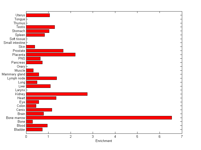 The expression level is normalized with tissue-library size. Each value for a gene in a tissue is a ratio of observed ESTs to the expected one in this tissue. The expected number of ESTs is the product of total ESTs of the gene and the fraction of total ESTs in the tissue among all ESTs in 30 tissues.