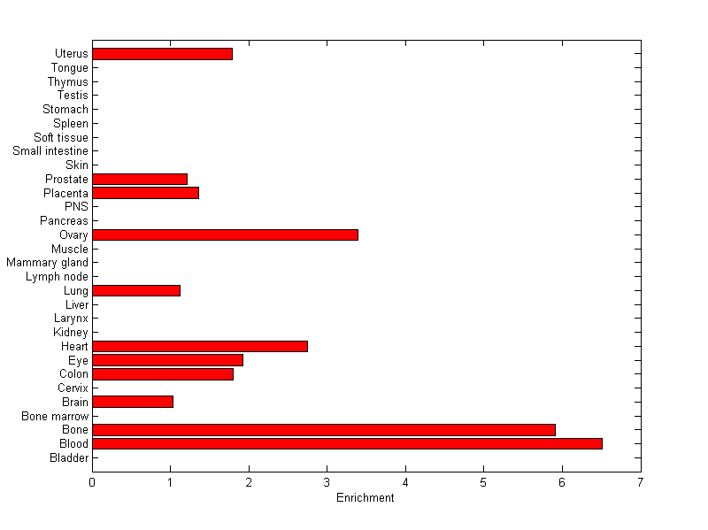 The expression level is normalized with tissue-library size. Each value for a gene in a tissue is a ratio of observed ESTs to the expected one in this tissue. The expected number of ESTs is the product of total ESTs of the gene and the fraction of total ESTs in the tissue among all ESTs in 30 tissues.