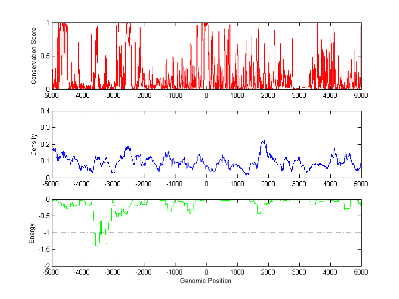 About the profiles: The conservation profile (red curve) is about conservation scores of the promoter sequences. Conservation was determined from an eight-way alignment of human, chimpanzee, dog, mouse, rat, chicken, zebrafish and fugu sequences. The conservation was quantified by a conservation score between 0 and 1, with 1 as highest conservation. The conservation score was obtained from UCSC genome databases. The density profile (blue curve) is about density of all TF binding sites. The energy profile (green curve) is about energy for module detection based on TF interaction. The positions with energy less than -1 indicate the existence of CRMs. Download: Conservation profileDensity profile Energy profile CRM summary |