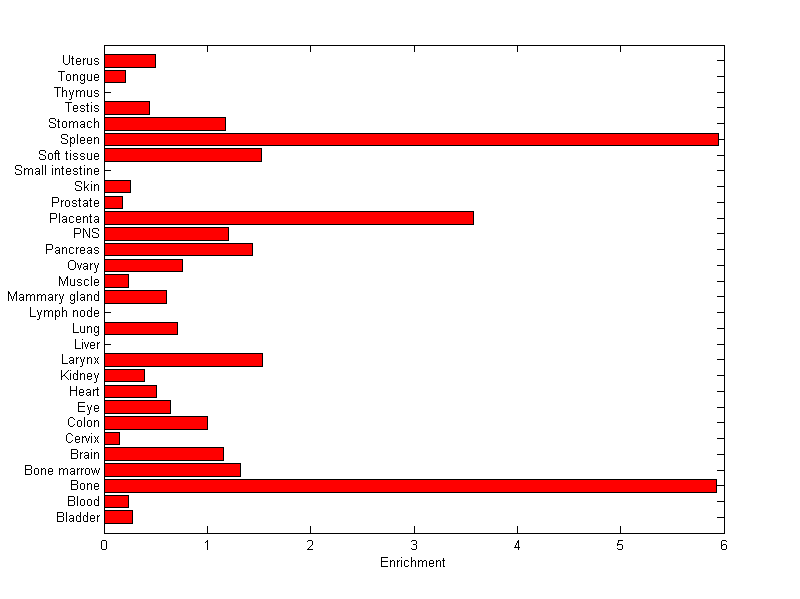 About the profile: The expression level is normalized with tissue-library size. Each value for a gene in a tissue is a ratio of observed ESTs to the expected one in this tissue. The expected number of ESTs is the product of total ESTs of the gene and the fraction of total ESTs in the tissue among all ESTs in 30 tissues. Summary: This gene is preferentially expressed in [bone, spleen] Download: |