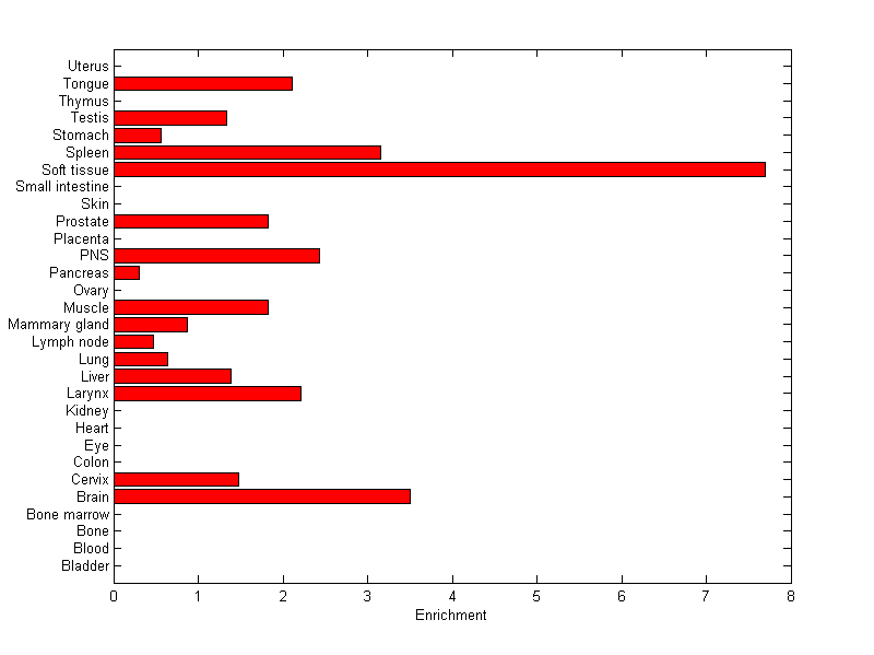 The expression level is normalized with tissue-library size. Each value for a gene in a tissue is a ratio of observed ESTs to the expected one in this tissue. The expected number of ESTs is the product of total ESTs of the gene and the fraction of total ESTs in the tissue among all ESTs in 30 tissues.