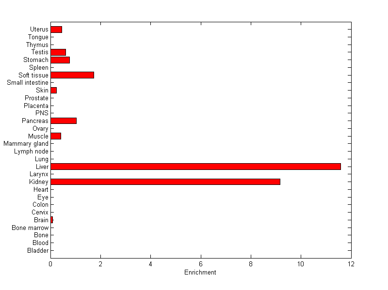 The expression level is normalized with tissue-library size. Each value for a gene in a tissue is a ratio of observed ESTs to the expected one in this tissue. The expected number of ESTs is the product of total ESTs of the gene and the fraction of total ESTs in the tissue among all ESTs in 30 tissues.
