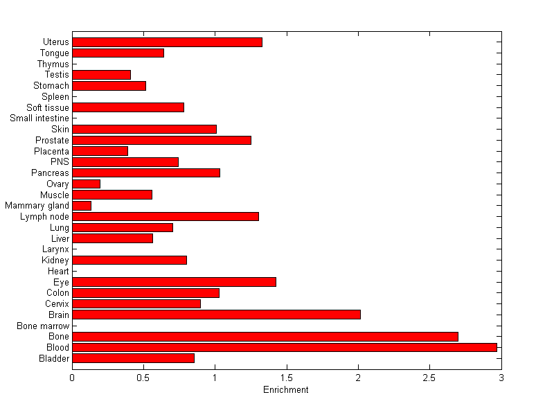 The expression level is normalized with tissue-library size. Each value for a gene in a tissue is a ratio of observed ESTs to the expected one in this tissue. The expected number of ESTs is the product of total ESTs of the gene and the fraction of total ESTs in the tissue among all ESTs in 30 tissues.