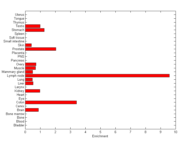 The expression level is normalized with tissue-library size. Each value for a gene in a tissue is a ratio of observed ESTs to the expected one in this tissue. The expected number of ESTs is the product of total ESTs of the gene and the fraction of total ESTs in the tissue among all ESTs in 30 tissues.