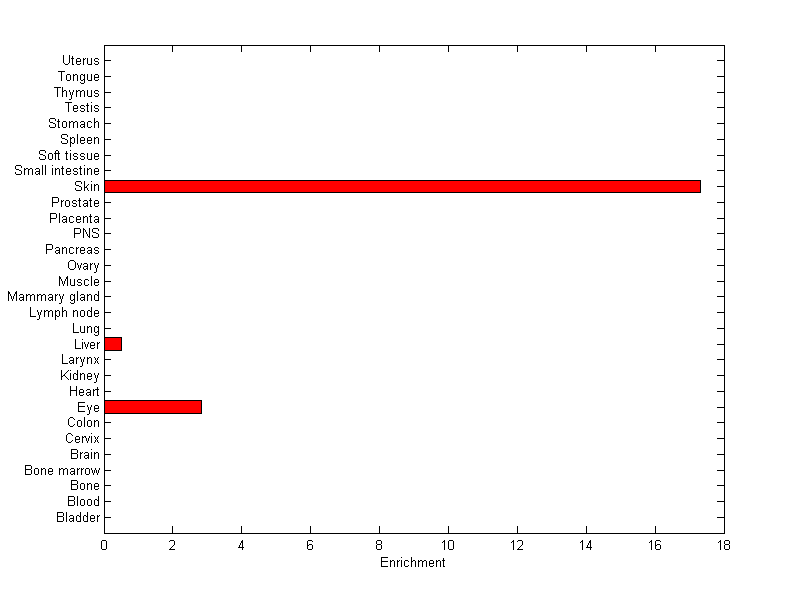 The expression level is normalized with tissue-library size. Each value for a gene in a tissue is a ratio of observed ESTs to the expected one in this tissue. The expected number of ESTs is the product of total ESTs of the gene and the fraction of total ESTs in the tissue among all ESTs in 30 tissues.