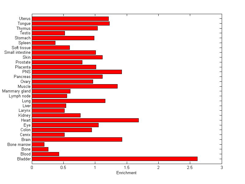 The expression level is normalized with tissue-library size. Each value for a gene in a tissue is a ratio of observed ESTs to the expected one in this tissue. The expected number of ESTs is the product of total ESTs of the gene and the fraction of total ESTs in the tissue among all ESTs in 30 tissues.