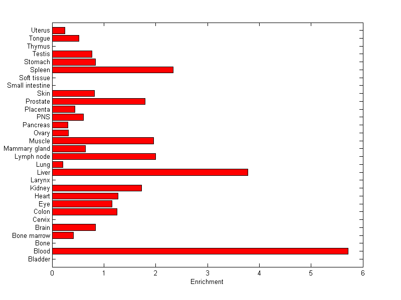 The expression level is normalized with tissue-library size. Each value for a gene in a tissue is a ratio of observed ESTs to the expected one in this tissue. The expected number of ESTs is the product of total ESTs of the gene and the fraction of total ESTs in the tissue among all ESTs in 30 tissues.