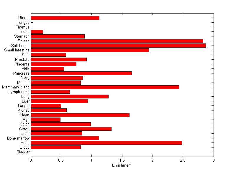 The expression level is normalized with tissue-library size. Each value for a gene in a tissue is a ratio of observed ESTs to the expected one in this tissue. The expected number of ESTs is the product of total ESTs of the gene and the fraction of total ESTs in the tissue among all ESTs in 30 tissues.