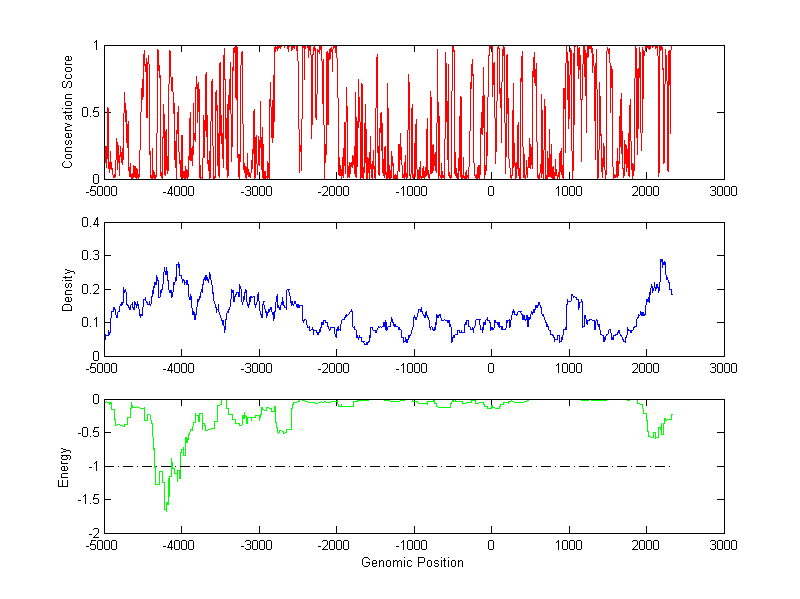About the profiles: The conservation profile (red curve) is about conservation scores of the promoter sequences. Conservation was determined from an eight-way alignment of human, chimpanzee, dog, mouse, rat, chicken, zebrafish and fugu sequences. The conservation was quantified by a conservation score between 0 and 1, with 1 as highest conservation. The conservation score was obtained from UCSC genome databases. The density profile (blue curve) is about density of all TF binding sites. The energy profile (green curve) is about energy for module detection based on TF interaction. The positions with energy less than -1 indicate the existence of CRMs. Download: Conservation profileDensity profile Energy profile CRM summary |
