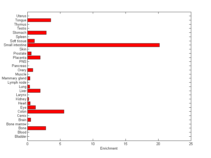About the profile: The expression level is normalized with tissue-library size. Each value for a gene in a tissue is a ratio of observed ESTs to the expected one in this tissue. The expected number of ESTs is the product of total ESTs of the gene and the fraction of total ESTs in the tissue among all ESTs in 30 tissues. Summary: This gene is preferentially expressed in [colon, small_intestine] Download: |