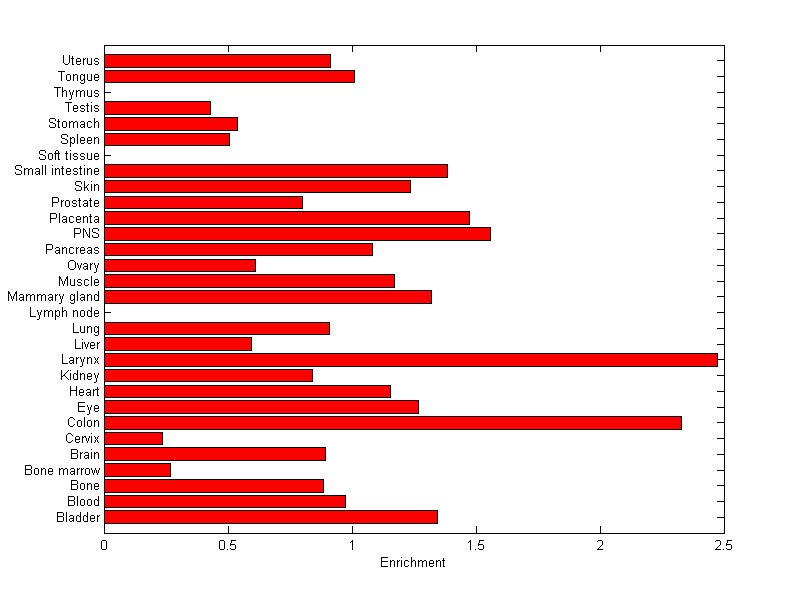 The expression level is normalized with tissue-library size. Each value for a gene in a tissue is a ratio of observed ESTs to the expected one in this tissue. The expected number of ESTs is the product of total ESTs of the gene and the fraction of total ESTs in the tissue among all ESTs in 30 tissues.