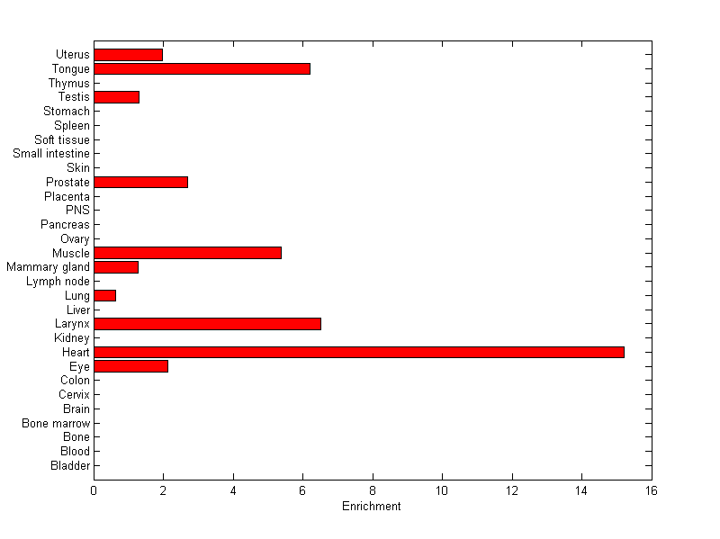 The expression level is normalized with tissue-library size. Each value for a gene in a tissue is a ratio of observed ESTs to the expected one in this tissue. The expected number of ESTs is the product of total ESTs of the gene and the fraction of total ESTs in the tissue among all ESTs in 30 tissues.