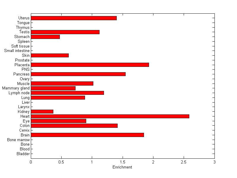 The expression level is normalized with tissue-library size. Each value for a gene in a tissue is a ratio of observed ESTs to the expected one in this tissue. The expected number of ESTs is the product of total ESTs of the gene and the fraction of total ESTs in the tissue among all ESTs in 30 tissues.