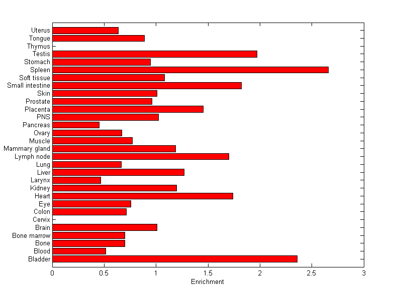 The expression level is normalized with tissue-library size. Each value for a gene in a tissue is a ratio of observed ESTs to the expected one in this tissue. The expected number of ESTs is the product of total ESTs of the gene and the fraction of total ESTs in the tissue among all ESTs in 30 tissues.