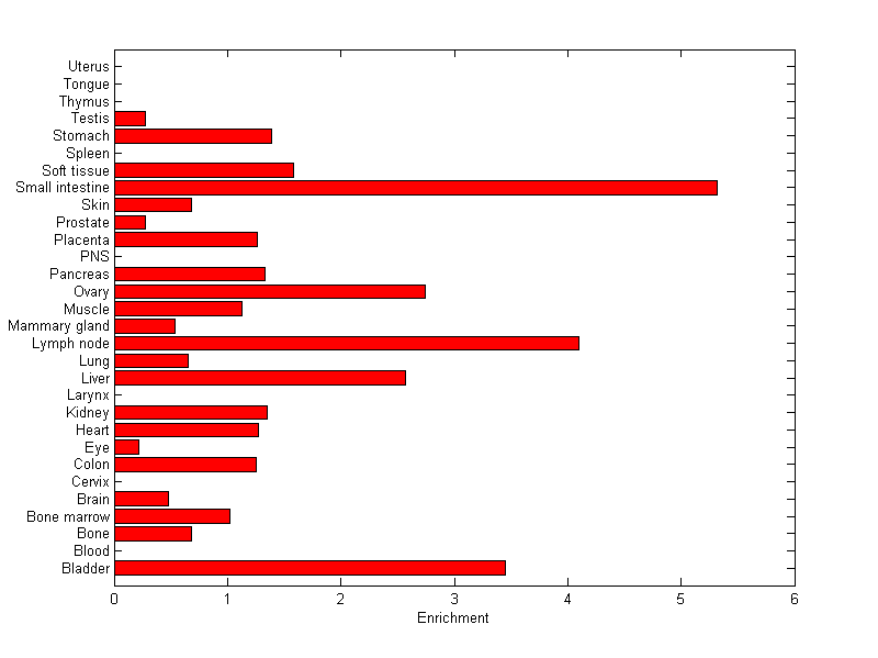 The expression level is normalized with tissue-library size. Each value for a gene in a tissue is a ratio of observed ESTs to the expected one in this tissue. The expected number of ESTs is the product of total ESTs of the gene and the fraction of total ESTs in the tissue among all ESTs in 30 tissues.