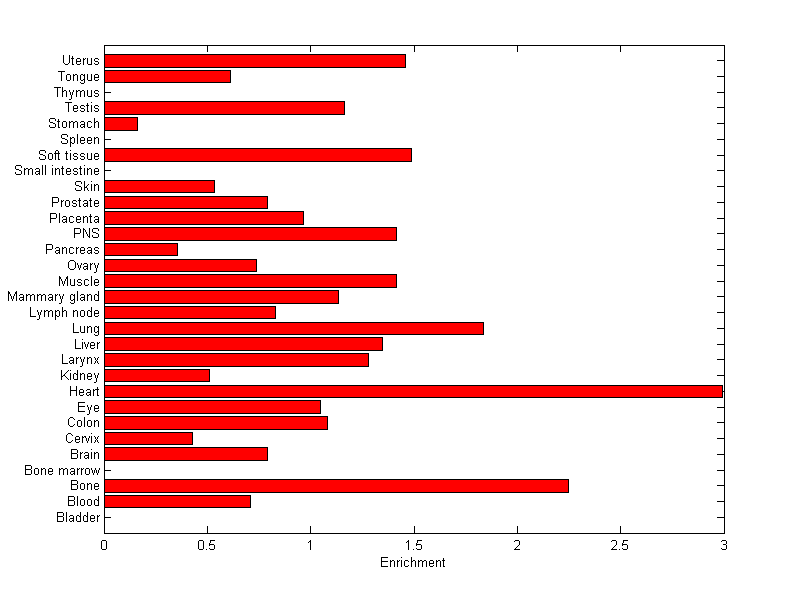 The expression level is normalized with tissue-library size. Each value for a gene in a tissue is a ratio of observed ESTs to the expected one in this tissue. The expected number of ESTs is the product of total ESTs of the gene and the fraction of total ESTs in the tissue among all ESTs in 30 tissues.