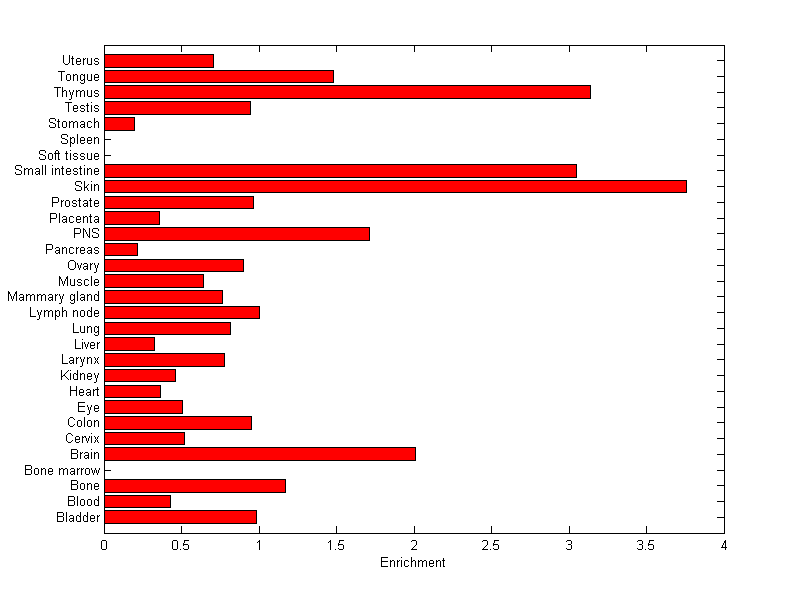 The expression level is normalized with tissue-library size. Each value for a gene in a tissue is a ratio of observed ESTs to the expected one in this tissue. The expected number of ESTs is the product of total ESTs of the gene and the fraction of total ESTs in the tissue among all ESTs in 30 tissues.