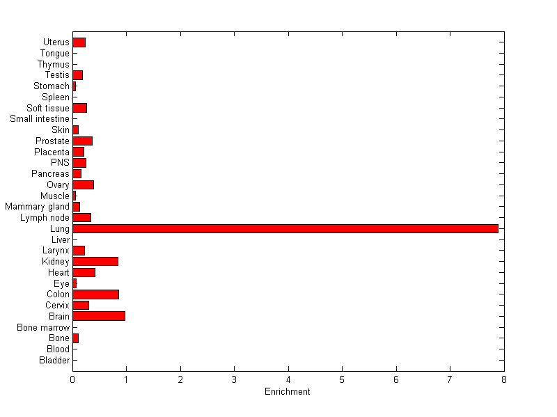 The expression level is normalized with tissue-library size. Each value for a gene in a tissue is a ratio of observed ESTs to the expected one in this tissue. The expected number of ESTs is the product of total ESTs of the gene and the fraction of total ESTs in the tissue among all ESTs in 30 tissues.