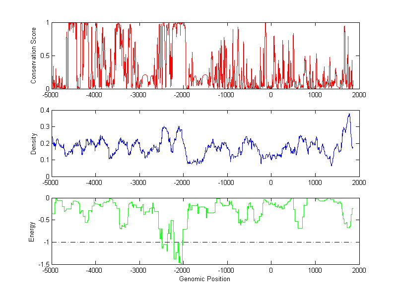 The energy profile (green curve) is about energy for module detection based on TF interaction. The positions with energy less than -1 indicate the existence of CRMs.