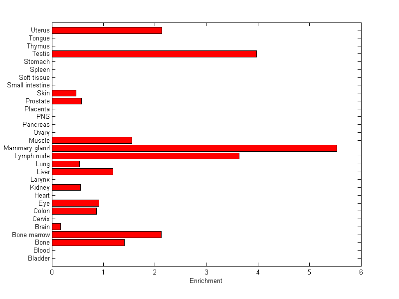 The expression level is normalized with tissue-library size. Each value for a gene in a tissue is a ratio of observed ESTs to the expected one in this tissue. The expected number of ESTs is the product of total ESTs of the gene and the fraction of total ESTs in the tissue among all ESTs in 30 tissues.