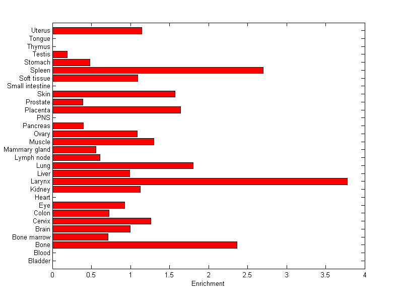 The expression level is normalized with tissue-library size. Each value for a gene in a tissue is a ratio of observed ESTs to the expected one in this tissue. The expected number of ESTs is the product of total ESTs of the gene and the fraction of total ESTs in the tissue among all ESTs in 30 tissues.