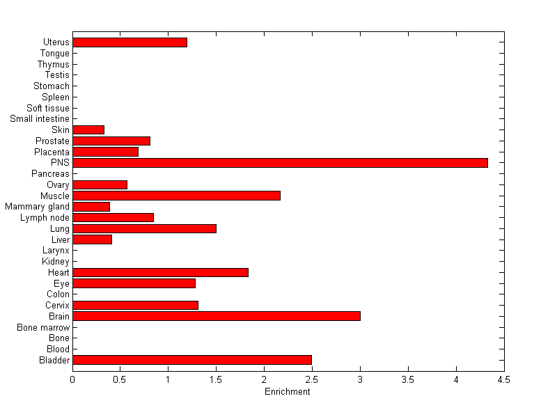 The expression level is normalized with tissue-library size. Each value for a gene in a tissue is a ratio of observed ESTs to the expected one in this tissue. The expected number of ESTs is the product of total ESTs of the gene and the fraction of total ESTs in the tissue among all ESTs in 30 tissues.