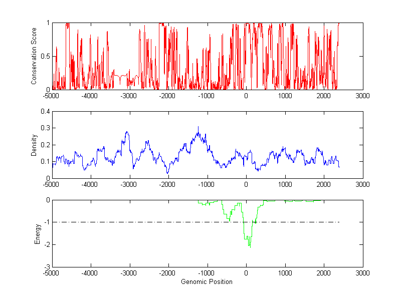 The energy profile (green curve) is about energy for module detection based on TF interaction. The positions with energy less than -1 indicate the existence of CRMs.