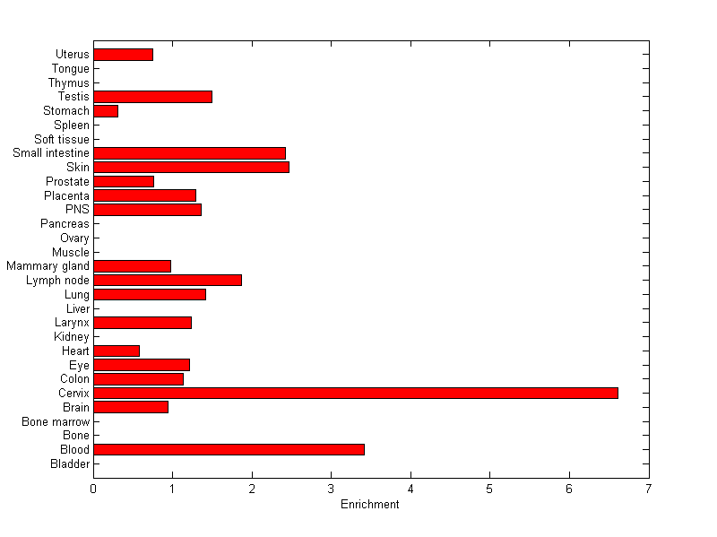 The expression level is normalized with tissue-library size. Each value for a gene in a tissue is a ratio of observed ESTs to the expected one in this tissue. The expected number of ESTs is the product of total ESTs of the gene and the fraction of total ESTs in the tissue among all ESTs in 30 tissues.