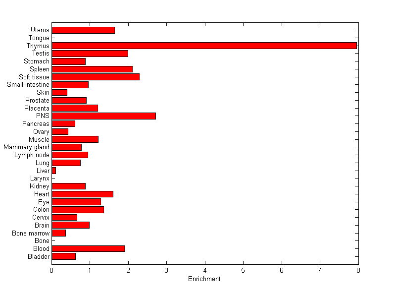 The expression level is normalized with tissue-library size. Each value for a gene in a tissue is a ratio of observed ESTs to the expected one in this tissue. The expected number of ESTs is the product of total ESTs of the gene and the fraction of total ESTs in the tissue among all ESTs in 30 tissues.