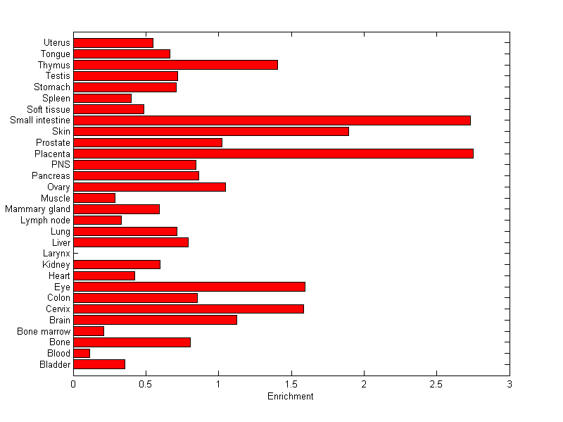 The expression level is normalized with tissue-library size. Each value for a gene in a tissue is a ratio of observed ESTs to the expected one in this tissue. The expected number of ESTs is the product of total ESTs of the gene and the fraction of total ESTs in the tissue among all ESTs in 30 tissues.