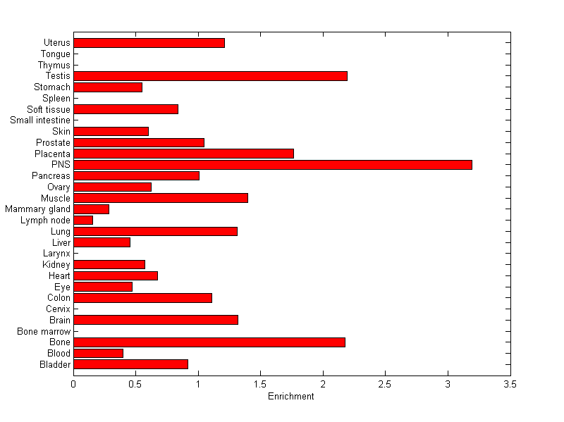 The expression level is normalized with tissue-library size. Each value for a gene in a tissue is a ratio of observed ESTs to the expected one in this tissue. The expected number of ESTs is the product of total ESTs of the gene and the fraction of total ESTs in the tissue among all ESTs in 30 tissues.