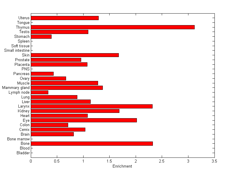 The expression level is normalized with tissue-library size. Each value for a gene in a tissue is a ratio of observed ESTs to the expected one in this tissue. The expected number of ESTs is the product of total ESTs of the gene and the fraction of total ESTs in the tissue among all ESTs in 30 tissues.
