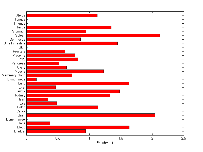 The expression level is normalized with tissue-library size. Each value for a gene in a tissue is a ratio of observed ESTs to the expected one in this tissue. The expected number of ESTs is the product of total ESTs of the gene and the fraction of total ESTs in the tissue among all ESTs in 30 tissues.