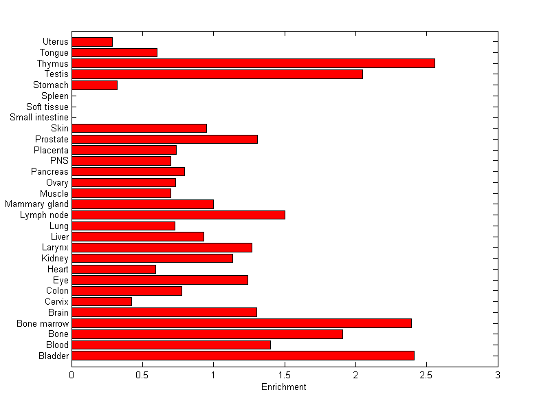 The expression level is normalized with tissue-library size. Each value for a gene in a tissue is a ratio of observed ESTs to the expected one in this tissue. The expected number of ESTs is the product of total ESTs of the gene and the fraction of total ESTs in the tissue among all ESTs in 30 tissues.