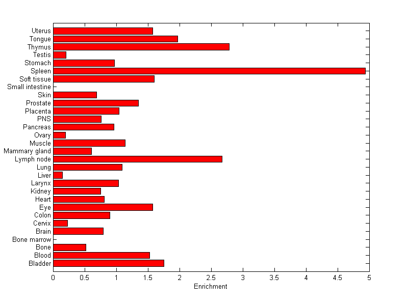 The expression level is normalized with tissue-library size. Each value for a gene in a tissue is a ratio of observed ESTs to the expected one in this tissue. The expected number of ESTs is the product of total ESTs of the gene and the fraction of total ESTs in the tissue among all ESTs in 30 tissues.