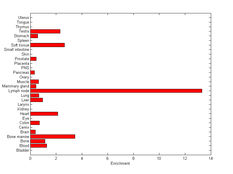 The expression level is normalized with tissue-library size. Each value for a gene in a tissue is a ratio of observed ESTs to the expected one in this tissue. The expected number of ESTs is the product of total ESTs of the gene and the fraction of total ESTs in the tissue among all ESTs in 30 tissues.