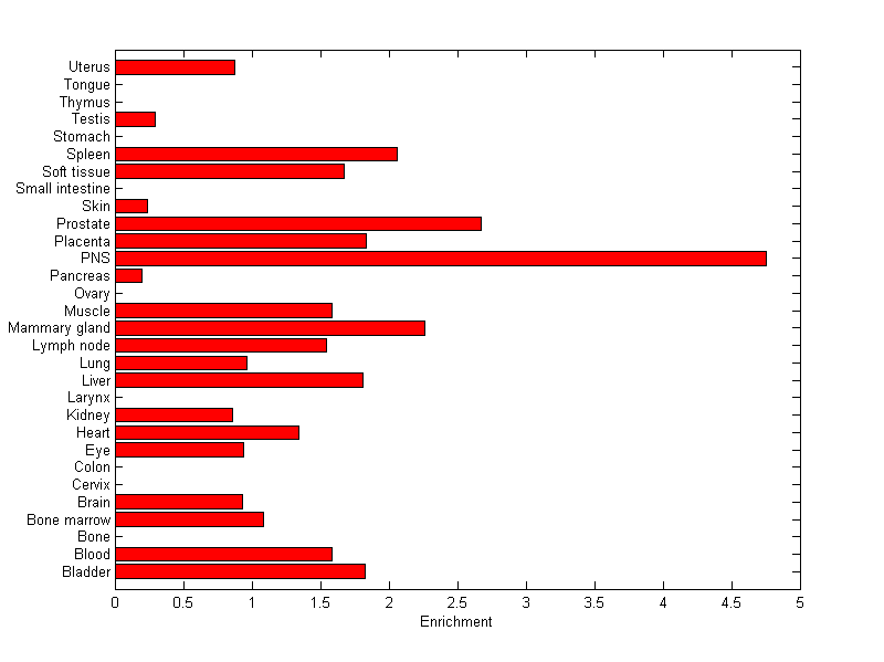 The expression level is normalized with tissue-library size. Each value for a gene in a tissue is a ratio of observed ESTs to the expected one in this tissue. The expected number of ESTs is the product of total ESTs of the gene and the fraction of total ESTs in the tissue among all ESTs in 30 tissues.