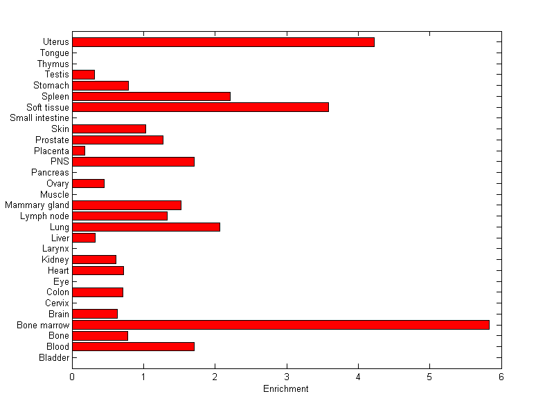 The expression level is normalized with tissue-library size. Each value for a gene in a tissue is a ratio of observed ESTs to the expected one in this tissue. The expected number of ESTs is the product of total ESTs of the gene and the fraction of total ESTs in the tissue among all ESTs in 30 tissues.