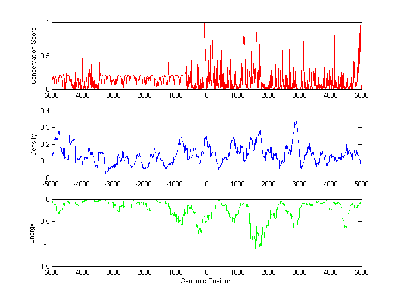 About the profiles: The conservation profile (red curve) is about conservation scores of the promoter sequences. Conservation was determined from an eight-way alignment of human, chimpanzee, dog, mouse, rat, chicken, zebrafish and fugu sequences. The conservation was quantified by a conservation score between 0 and 1, with 1 as highest conservation. The conservation score was obtained from UCSC genome databases. The density profile (blue curve) is about density of all TF binding sites. The energy profile (green curve) is about energy for module detection based on TF interaction. The positions with energy less than -1 indicate the existence of CRMs. Download: Conservation profileDensity profile Energy profile CRM summary |