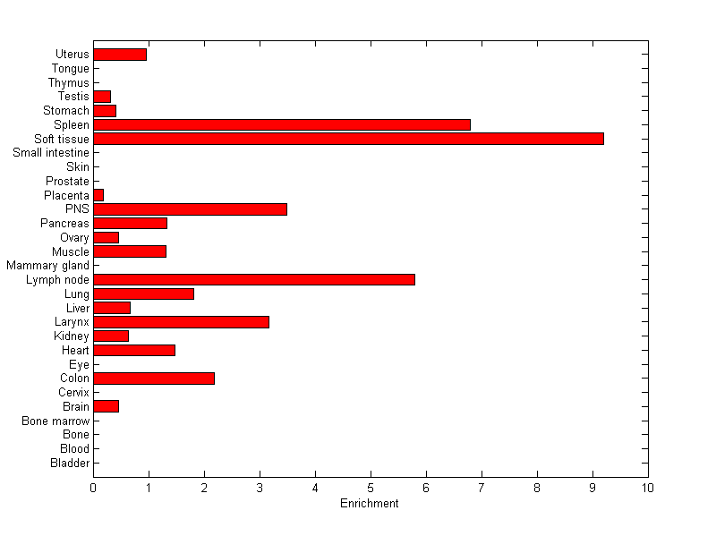 About the profile: The expression level is normalized with tissue-library size. Each value for a gene in a tissue is a ratio of observed ESTs to the expected one in this tissue. The expected number of ESTs is the product of total ESTs of the gene and the fraction of total ESTs in the tissue among all ESTs in 30 tissues. Summary: This gene is preferentially expressed in [lymph_node, soft_tissue] Download: |