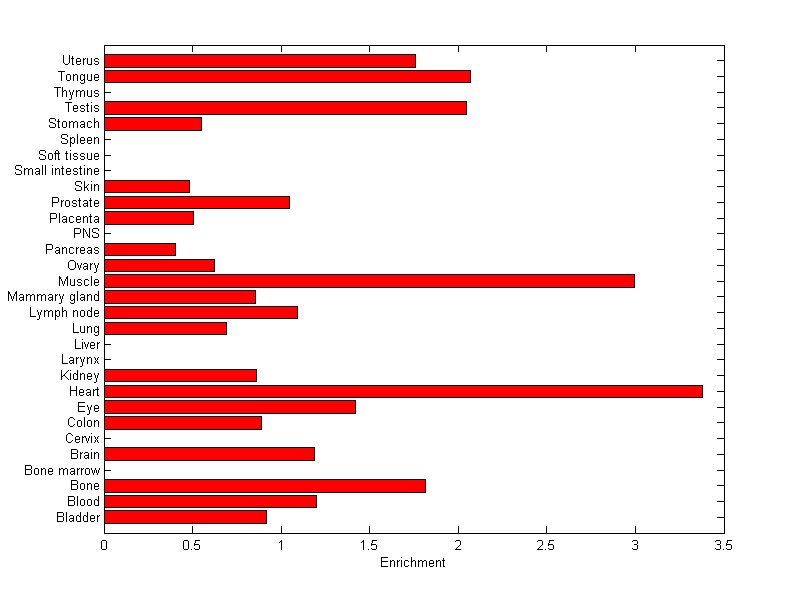 The expression level is normalized with tissue-library size. Each value for a gene in a tissue is a ratio of observed ESTs to the expected one in this tissue. The expected number of ESTs is the product of total ESTs of the gene and the fraction of total ESTs in the tissue among all ESTs in 30 tissues.