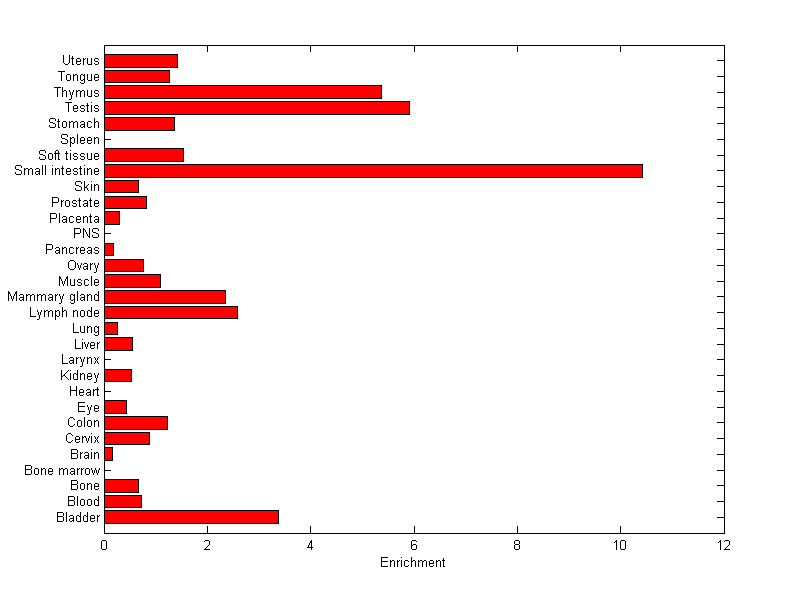 The expression level is normalized with tissue-library size. Each value for a gene in a tissue is a ratio of observed ESTs to the expected one in this tissue. The expected number of ESTs is the product of total ESTs of the gene and the fraction of total ESTs in the tissue among all ESTs in 30 tissues.
