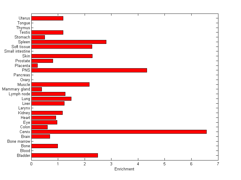 The expression level is normalized with tissue-library size. Each value for a gene in a tissue is a ratio of observed ESTs to the expected one in this tissue. The expected number of ESTs is the product of total ESTs of the gene and the fraction of total ESTs in the tissue among all ESTs in 30 tissues.