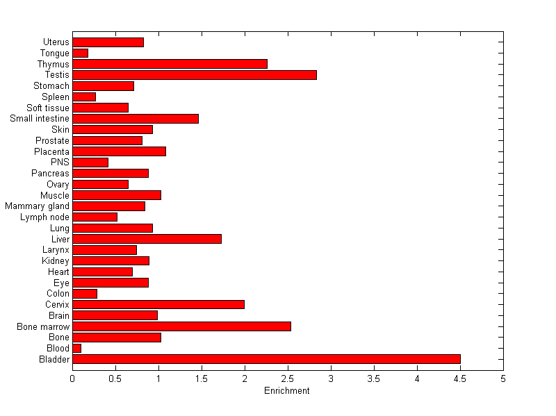 The expression level is normalized with tissue-library size. Each value for a gene in a tissue is a ratio of observed ESTs to the expected one in this tissue. The expected number of ESTs is the product of total ESTs of the gene and the fraction of total ESTs in the tissue among all ESTs in 30 tissues.