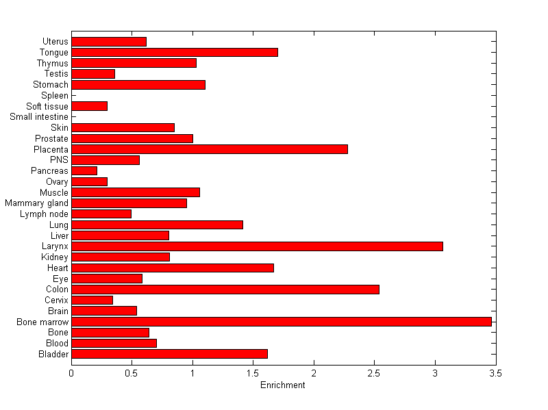 The expression level is normalized with tissue-library size. Each value for a gene in a tissue is a ratio of observed ESTs to the expected one in this tissue. The expected number of ESTs is the product of total ESTs of the gene and the fraction of total ESTs in the tissue among all ESTs in 30 tissues.