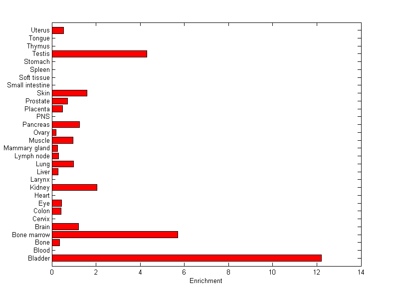 The expression level is normalized with tissue-library size. Each value for a gene in a tissue is a ratio of observed ESTs to the expected one in this tissue. The expected number of ESTs is the product of total ESTs of the gene and the fraction of total ESTs in the tissue among all ESTs in 30 tissues.
