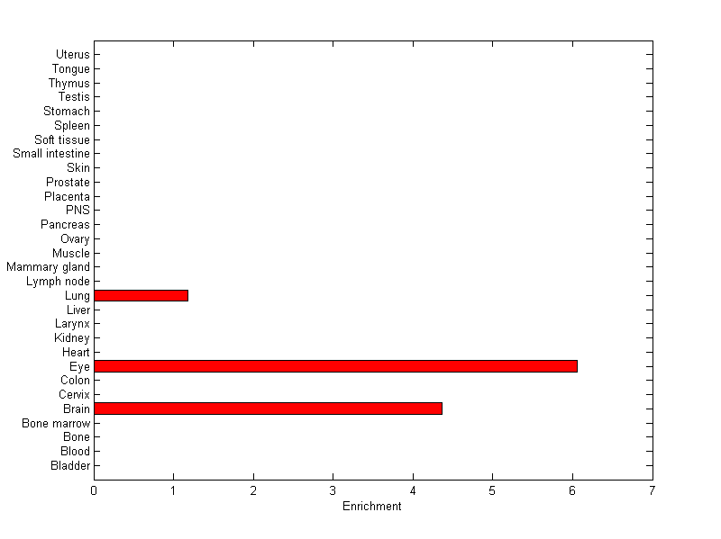 The expression level is normalized with tissue-library size. Each value for a gene in a tissue is a ratio of observed ESTs to the expected one in this tissue. The expected number of ESTs is the product of total ESTs of the gene and the fraction of total ESTs in the tissue among all ESTs in 30 tissues.