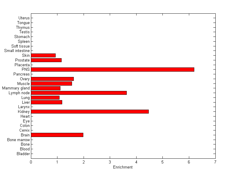 The expression level is normalized with tissue-library size. Each value for a gene in a tissue is a ratio of observed ESTs to the expected one in this tissue. The expected number of ESTs is the product of total ESTs of the gene and the fraction of total ESTs in the tissue among all ESTs in 30 tissues.